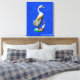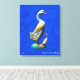 Pato de madeira pintado e esculpido com seu patinho, fortemente curado, sobre fundo azul. Adicione seu próprio texto.
