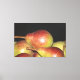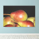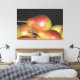 Impressão de fruta de canvas grande e colorida com peras. As cores incluem preto de carvão, verde, vermelho queimado e Browns.