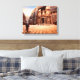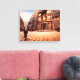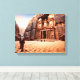 A majestic view of the Treasury in Petra, Jordan, at sunrise, with a lone figure walking towards it.