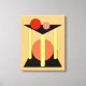 Nessa trabalho de arte de abstrato, um círculo laranja se senta entre três pilares amarelos em uma base quadrada ou retangular, enquanto um círculo vermelho e vermelho suave se senta sobre uma plataforma triangular sobre os pilares
