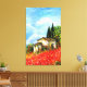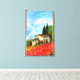 Paisagem da Toscana, beleza colorida, vibrante e expressiva dos campos rurais italianos e da papoila vermelha, bela flora de Verão em verde claro, amarelo, castanho, azul, branco, prados, campo de flores, cinza e oliveiras, antiga casa de fazenda rustica sob o céu azul e nuvens brancas. Pintura acrílica em canvas.