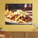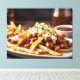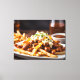Um prato de Poutine com batatas fritas, queijo e molho.