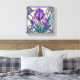 A purple iris flower with yellow accents, surrounded by green leaves and a blue floral border, art nouveau style, intricate details, vibrant colors, elegant design.