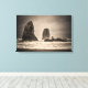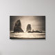 Uma imagem amontoada das Agulhas, empilhadas rochosas espiras, na praia de Cannon, em Oregon, num dia nublado e tempestuoso.