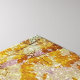 A imagem mostra uma vista olhando para os prédios da cidade através dos galhos de uma árvore com ouro de folhas de outono. Os prédios têm um estilo arquitetônico moderno com muitas janelas. O céu é visível em trechos entre folhas e prédios, com matiz azul macio. A paleta de cores é quente, dominada por amarelos, laranjas e castanhos, com azuis legal contrastantes.