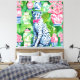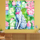 Chita azul e branca entre folhas de bananas e frascos de chinoiserie