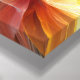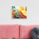The image showcases an abstract floral design with a vibrant color palette. The artwork features layered, petal-like shapes in shades of yellow, orange, white, and turquoise. These translucent forms create a sense of depth and movement, resembling stylized flowers. The background is dark, which makes the colors pop.