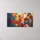 Uma raposa se mantém confiante, exibindo seu vibrante pelo laranja. O fundo apresenta um padrão geométrico colorido, criando uma atmosfera interior viva.
