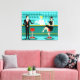 Cada hora é feliz com esta Impressão de Tela Estreita de Cocktail Retro. O design moderno do meio século apresenta um vibrante estilo, minimalista, de 1960 desenho de um bar de coquetel clássico. Contra o pano de fundo de uma parede aqua, podemos ver filas de óculos de bebida. Pelo menos podemos ver os teais silhuetas de óculos de bebida. A julgar pelas formas do material, este bar está bem equipado para molhar o assobio, seja qual for a sua preferência pela bebida. Um barman mais competente e personável é manejar o bar com sotaques amarelos. O jovem barman está vestindo uma camisa branca e primitiva com gravata arco preta. Sua boa aparência, cabelo louro e óculos de hipster pretos nos dão todas as razões para acreditar que ele passa seus dias como um ator em luta ou um super-herói. Por um lado, o bonito mixologista está entregando um martini a um cliente do lado oposto do bar. O cliente que espera é um cavalheiro de ombros largos com um terno preto e gravata vermelha. Ele é o tipo de sujeito que é descrito como alto, escuro e bonito mesmo quando ainda é horas até a hora de fechar. Parece que há um banco de bares vermelho e cromo com o nome do Sr. Debonair. No entanto, para não ser presunçoso, ele pergunta, "Desculpe-me. Este assento está ocupado?" Ele está perguntando à garota cabeleira no banco de bares vizinho. Ela é do tipo "garota ao lado", se você vive ao lado de uma beleza perfeita com uma figura que não desiste. Ela está vestindo um vestido preto e segurando um martini em uma mão. Ela espera que ela e o cavalheiro que se aproxima tenham mais em comum que a sua preferência pela bebida e a escolha da cor da roupa. Parece que esta noite ficou interessante. Saúde para você!