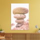 Uma pilha de quatro pedras lisas e cinzas é cuidadosamente balanceada em uma rocha maior, texturizada. As pedras são dispostas em forma de pirâmide, com a maior pedra no topo e a menor no fundo. O fundo é uma imagem macia e desfocada de uma praia com uma rosa claro e um céu azul. A imagem tem uma atmosfera calmante e serena, sugerindo um senso de equilíbrio e tranquilidade.