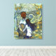Um design de arte de uma garota e um garoto de mãos dadas andando na floresta.