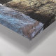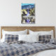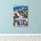 Uma pintura paisagem digital de Vermont cênico. Stowe Mountain sobe acima de Moss Glen Falls, com um céu azul claro como fundo. À medida que a água fria desce para ir abaixo de uma ponte coberta, ela acaba em Warren Falls. Há uma borda preta ao redor da trabalho de arte. Em uma fonte branca há, "Vermont", "Linda Rota 100". E você pode encontrar o ano de estado nas passagens da ponte, parecendo um 1791 gravado. Um peru fica atento à entrada da ponte. Imagem Copyright ©2023 Kimberly J Tilley.