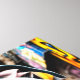 Arte digital urbana colorida com um Brindle Pitbull sentado numa rua da cidade rodeada por arte de rua de grafite.