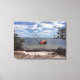 A cena nesta Impressão de Tela é uma fotografia original de ZoeSPEAK de um barco a vela em águas rasas. Na foto, o barco vermelho é inclinado para um lado, emoldurado por manguezais, uma margem arenosa e um céu azul grande cheio de nuvens brancas e onduladas.
