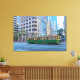 Um vintage viagem verde e amarelo de elétrico ao longo da rua de São Francisco, seu movimento esboroou ligeiramente. O elétrico está em primeiro plano, enquanto os edifícios altos com janelas de vidro ficam na rua ao fundo. A paisagem urbana se movimenta com atividade, com pedestres e carros visíveis a distância.