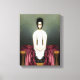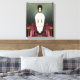 Uma menina assustadora com cabelo escuro curto, olhos grandes e entorpecidos e sem boca, seus braços aparecendo como camisa de força. Sentada em uma sala verde em um sanatório, um cobertor de cetim vermelho é enrolado ao redor de seu tronco sem pernas. Arte digital original de Taylor Addams.