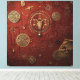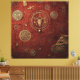 An ornate emblem glows in gold against a textured crimson backdrop, surrounded by arcane symbols and cryptic inscriptions.