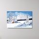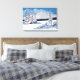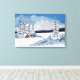 Uma tela impressa com uma bela cena de inverno, incluindo montanhas nevadas, cabana rústica e neve cobertas por vergreens. Arte original por W.B.