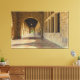 A imagem mostra um longo corredor na Universidade de Stanford construído com pedra marrom-claro, apresentando uma série de arcos apoiados por colunas ao longo de um lado. O chão está coberto por um padrão de bronzeado claro e azulejos castanhos avermelhados. O corredor se estende até a distância, com um vislumbre de verde visível na extremidade oposta. As luzes de travagem são suspensas do teto.