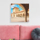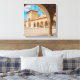 A imagem mostra a arquitetura da Universidade de Stanford, com um pátio formado por arcos e colunas de pedra. Uma torre proeminente com um telhado vermelho sobe ao fundo, flanqueada por palmeiras contra um céu azul com nuvens espalhadas. O pátio é pavimentado com tijolos castanhos avermelhados, e os prédios de pedra são adornados com videiras para subir.