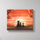 Dois cachorros e uma silhueta de gatos observando o pôr do sol numa noite de outono. Cor de queda laranja vívida e brilhante. Com duas árvores de ambos os lados com folhas de outono em queda e aves voando em direção ao pôr do sol. Cenário de queda Arte Original de Pintura Acrílica feita por Donna Leger para Designs de Ironia. Todos os Direitos Reservados.