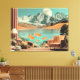 This surreal artwork blurs the boundary between interior comfort and boundless imagination. A calm, softly furnished room opens onto a dreamlike landscape where still water stretches toward towering mountains beneath a luminous moon. The scene feels intimate yet infinite, as if the walls of the room have dissolved into a peaceful alternate reality. Floating fish drift effortlessly through crystal-clear water just beyond the threshold, bringing gentle motion and life into an otherwise serene setting.