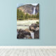 As águas balançadoras de Takakkaw caem no Parque Nacional Yoho, na Colúmbia Britânica, Canadá. Esta atração turística popular apresenta as águas azuis turquesas do derretimento de geleira. Ele cai a 1246 pés no rio Yoho abaixo.