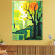 A imagem é uma pintura abstrata e texturizada que retrata um pôr do sol vibrante sobre a água. O sol laranja intenso é o ponto focal, refletindo-se na superfície escura da água com pinceladas de luz. A paleta de cores transita do laranja e amarelo quentes, que representam o céu no crepúsculo, para tons mais frios de azul e preto que dominam a porção superior direita e a parte inferior da pintura, sugerindo a transição do dia para a noite e a presença da paisagem noturna ou da água. A textura proeminente adiciona profundidade e dramaticidade à cena, com acúmulos de tinta que podem evocar a sensação das nuvens, da superfície da água ou até mesmo da terra ou rochas na margem. A obra evoca uma atmosfera de intensidade e transição, capturando a beleza dramática de um pôr do sol.