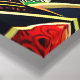 Uma composição vibrante apresenta uma intrincada mistura de formas giratórias e cores vívidas, formando uma paisagem abstrato. Elementos orgânicos como árvores e folhas são entrelaçados com padrões geométricos, criando uma cena dinâmica e harmoniosa.