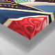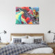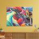 Uma composição vibrante apresenta uma intrincada mistura de formas giratórias e cores vívidas, formando uma paisagem abstrato. Elementos orgânicos como árvores e folhas são entrelaçados com padrões geométricos, criando uma cena dinâmica e harmoniosa.