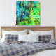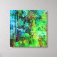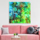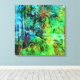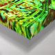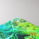 Um padrão vibrante e intrincado preenche a cena, dominado por tons de verde com pistas de laranja e azul. Formas giratórias e motivos orgânicos se misturam, criando um sentido de movimento e complexidade.