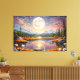 Contemplate the magic of a giant moon reflected in serene waters, surrounded by snow-capped mountains and a starry sky in pink and golden tones. This fantastic artwork transports you to an enchanted realm where dreams come true. Stunning digital art that brings peace, mystery, and cosmic beauty to your space.