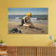 A woman with short blonde hair is seated on a sandy beach, looking down with a gentle smile on her face. Dressed in a classic black swimsuit, she is surrounded by a serene seascape, with a hat, sunglasses, and a small red crab nearby.