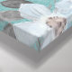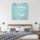 Tela impressa com tipografia branca angustiada sobre fundo aqua texturizado cercado por flores aquáticas, com verso bem conhecido dos romanos 8:28, "... Todas as coisas funcionam juntas para o bem daqueles que amam Deus..."