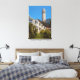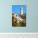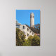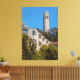 A imagem mostra Torre Coit em São Francisco, Califórnia, ascensão acima dos prédios e árvores ao redor. A torre é uma cor de cinza clara e fica alta contra um céu azul claro. No primeiro plano, há edifícios residenciais com uma mistura de estilos arquitetônicos, incluindo um edifício com fachada arredondada e aparada e um edifício moderno com uma série de varandas.