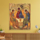 Trinity Angels At Mamre - bela pintura cristã medieval de andre rublev de sua interpretação da trindade com três anjos com asas ouros, halo, verde, azul e dourado, sentados ao redor de uma mesa com uma tigela ouro. tempos medievais pintura ilustrativa de arte fina em blues, dourados e verdes, em uma delicada e refinada pintura religiosa. Lindas cores ouros design e na moda com cores elegantes e cores de ouro frescas e nítidas com efeito brilhante, mas colorido e radiante.