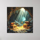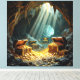 Tief verborgen in einer geheimnisvollen Höhle leuchten unzählige Goldmünzen und Schatztruhen im Licht der Sonnenstrahlen, die durch eine Öffnung in der Decke dringen. Eine Szene wie aus einem Märchen – reich an Magie, Abenteuer und uralten Geheimnissen.