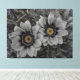 A pair of delicate daisies take centre stage in this striking selective‑colour photograph. The petals and surrounding foliage are rendered in smooth grayscale, creating a calm, monochrome backdrop. At the heart of each bloom, vivid yellow‑orange centres burst with warmth and detail, forming a dramatic contrast that immediately draws the eye. Fine water droplets rest on the petals and leaves, adding texture and a sense of freshness. The combination of soft tones and vibrant colour accents gives the artwork a modern, elegant feel that suits home décor, nature lovers, and contemporary art collections.
