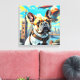 Um Bulldog Francês fica em destaque no telhado com um pano de fundo de uma fantástica paisagem urbana com marcos globais icônicos. Vários dirigíveis flutuam no céu, somando-se à atmosfera química.