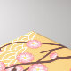 Ilustração vetorial de uma garota oriental bonitinha em um vestido kimono cor de pêssego com uma faixa grande de ameixa obi segurando uma sacola cor-de-rosa. O cabelo preto da menina é decorado com fitas e pinos do estilo geisha. A boneca é nomeada por uma árvore de fumaça japonesa que está relacionada tanto a ameixa quanto a damascos. Esta trabalho de arte foi inspirada pelas bonecas kokeshi tradicionais do Japão. O fundo amarelo claro tem um padrão tradicional de onda japonesa e é decorado com galhos florescentes de árvores.