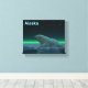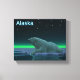 Um momento pacífico na longa noite árctica. Um Urso Polar repousa na borda de uma área aberta no gelo da matilha. As Luzes do Norte brilham à distância; estrelas brilhantes brilham sobre a cabeça. A leitura de texto "Alaska" aparece em azul e branco brilhantes. Os ursos polares estão ameaçados. Quanto tempo mais cenas como esta poderão ocorrer? Por favor, ajude a salvar os Ursos Polares da extinção.