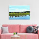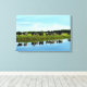Esta canvas de arte tem uma bela foto de uma linha de vacas leiteiras de raça Holstein negra e branca, seguidas, em uma vibrante pastagem verde com um buraco de água no primeiro plano que reflete as vacas e o céu azul brilhante e turvo Alberta.