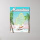 Mapa ilustrado da Maurícia em uma bela vintagem ou estilo retrô, com um avião marítimo pousando em uma bela praia.