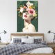 Uma trabalho de arte digital cativante de uma mulher com flores e uma verde esmagadora adorando seu rosto, obscurecendo seus olhos e criando um senso de mistério e conexão com a natureza. Suas feições suaves e estilizadas contrastam com as vibrantes flores e folhagem, enquanto o rico fundo verde destaca a beleza de sua coroa floral. A composição mescla surrealismo e elegância, incorporando uma harmonia entre forma humana e natureza.