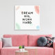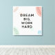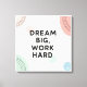 Arte de parede inspiradora minimalista com tipografia ousada que diz "Dream Big, Work Duro". Projetado no estilo escandinavo com fundo branco limpo e sotaques pastéis suaves. Impressão de parede motivacional perfeita para sala de estar, quarto, escritório ou decoração doméstica. Uma ideia moderna de presente para estudantes, empreendedores ou qualquer pessoa que ame arte estética minimalista.