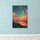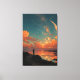 A solitary figure stands on a rocky outcrop overlooking calm waves, dwarfed by an enormous glowing crescent moon that fills the sky with soft luminescence. Dense stars sparkle across deep teal and indigo, blending into vibrant orange, rose, and golden clouds along the horizon where the last light of day lingers. Gentle surf reflects molten hues in rippled amber and crimson, creating perfect symmetry between earth and cosmos. The scene radiates profound solitude, cosmic wonder, quiet introspection, the threshold between day and night, and the sublime beauty of standing small before the infinite—perfect for meditation rooms, bedrooms, home offices, therapy spaces, modern minimalist decor, or as deeply symbolic gifts for dreamers, spiritual seekers, night-sky lovers, or anyone embracing personal reflection, awe, and quiet courage.