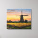 A canvas representation in the impressionist pictorial style of a Dutch windmill in the countryside at sunset.