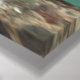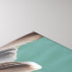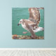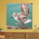 Uma gaivota com penas marrons e brancas se posiciona sobre um píer com penas, suas asas se espalham como se se preparasse para pegar voo. A cabeça do pássaro é virada para o lado, seu bico amarelo ligeiramente aberto. O fundo apresenta um oceano calmo, cor de lacre, criando uma atmosfera serena e pacífica.