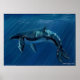 A impressão Harmoniosa da Baleia Humpback pela artista da vida selvagem Michaeline McDonald apresenta uma baleia jubarte debaixo da água com raios solares e faíscas brilhando e refletindo sobre a baleia. Cores azuis profundas.
