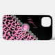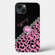 Glamorous Samsung Galaxy Note 4 case feito em preto, com um impressão pintado cor-de-rosa e preto pintado correndo diagonalmente pelo lado inferior direito do gabinete. Gráficos de uma borda de diamante, na borda da impressão onça-pintada, tem uma joia cor-de-rosa e prateada, no meio. Personalize o texto cor-de-rosa para você mesmo ou como uma ideia perfeita de presente.